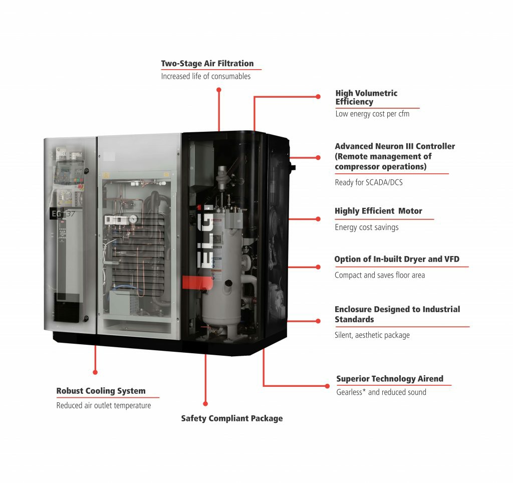 ELGI GLOBAL (EG Series) Screw Type Air Compressors are one of the most energy efficient Air Compressors in the world. Salient Features are -  • Direct Driven (Not Belt Driven)  • Low RPM of Air End  • Energy Efficient IE3/IE4 Main Motors  • Built in Dryers and VFD as options  • High End Neuron Controller  • Low Noise Levels  • Easy Serviceability  • Excellent Aesthetics