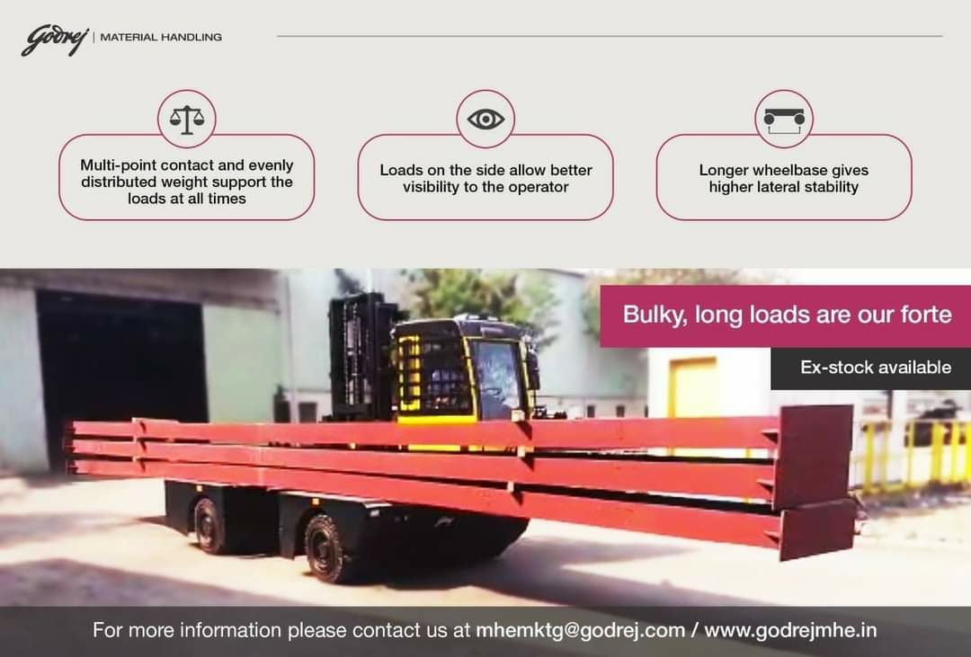 This is the age of the specialist, a breed whose expertise in a field guarantees managing its tasks proficiently, safely and in the shortest possible time. The Godrej 5 tonne diesel powered 'Side Loader' is an example of a specialist to handle long loads in your factory or warehouse. Working in aisles as narrow as 2.5 meters, it saves you expensive floor space. For more information please leave us your details here, our team will be happy to connect with you. Specially suitable for long loads like • Pipes • Glass • Towers • Tanks • Wood logs etc.