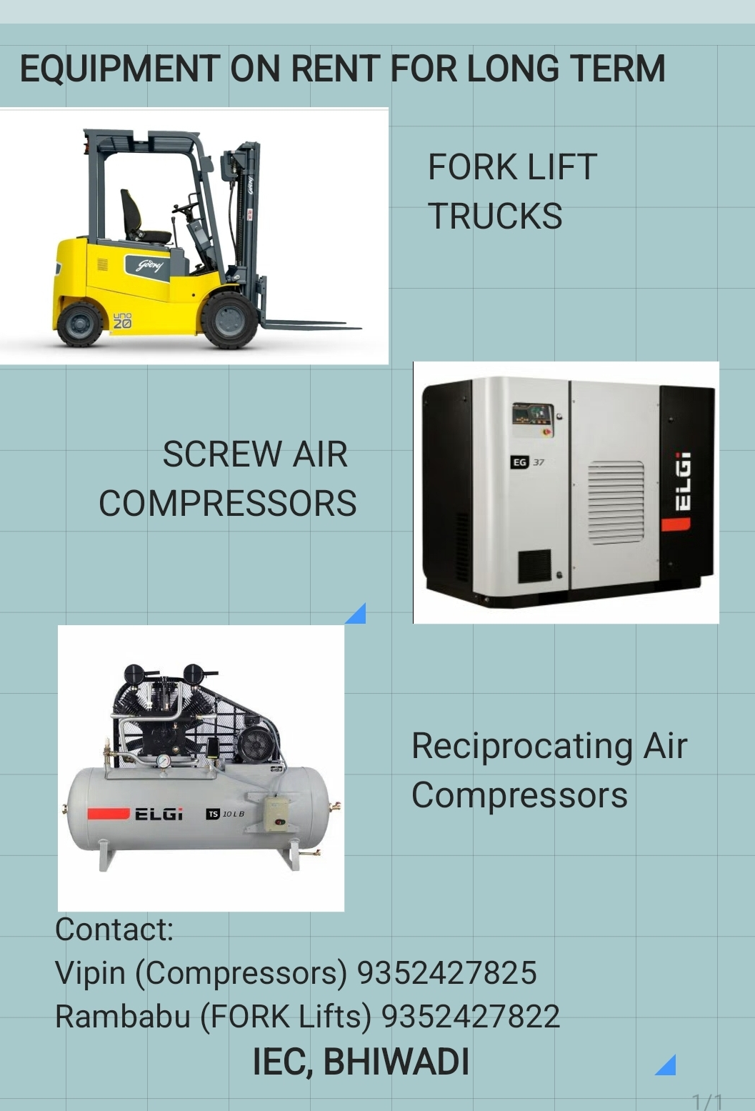 We have a Large Fleet of Equipment for purpose of Renting. Equipment like Fork Lift Trucks, Reach Trucks, Stackers Air Compressors etc are available on hiring basis.